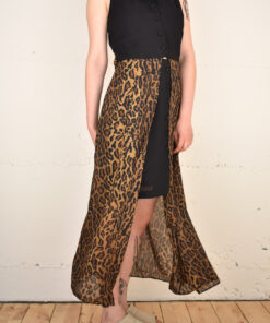 Das Kleid besteht aus einem schwarzen Unterkleid (das vorne von oben bis unten geknöpft wird und aus zwei zusammengenähten Teilen besteht), sowie einer zweiten leicht durchscheinenden Stofflage im Leo-Print, die auf Hüfthöhe angenäht ist und sich auf der Vorderseite mittig splittet. Der Kragen ist ebenfalls mit dem gemusterten Stoff geziert. Das Kleid wird im Rücken mit zwei Stoffbahnen gebunden.