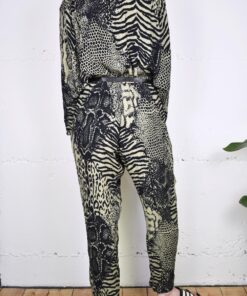 80er Jahre Jumpsuit aus 100% Viskose in der Größe 42 (ohne Gürtel). Lange Ärmel und zwei Seitentaschen.