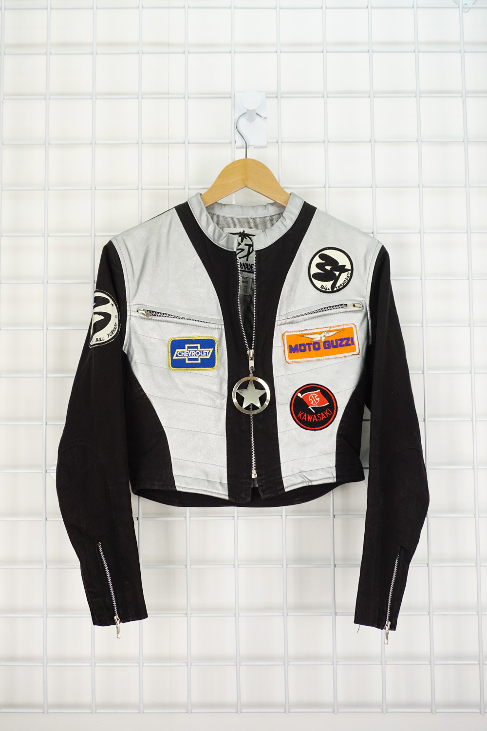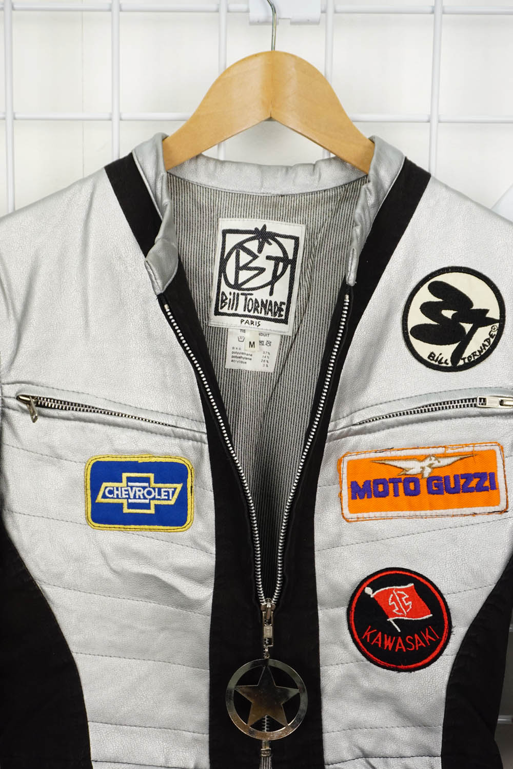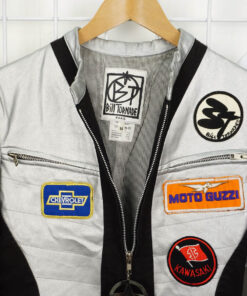 Die Vorderseite zieren aufgenähte Patches im Bikerstyle: Chevrolet, Moto Guzzi, Kawasaki. Rückseite der Jacke schwarz.