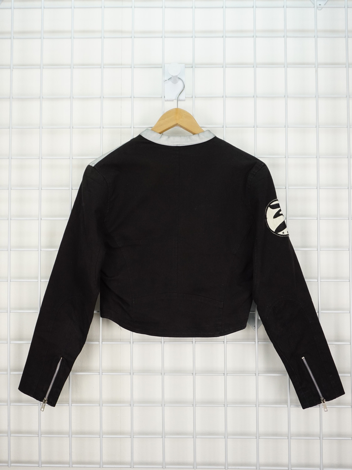 Enganliegende kurze Jacke im Biker-Style mit zwei Brusttaschen und Reißverschlüssen an den Ärmeln und Rundhals-Kragen. Die Jacke ist aus festem Baumwollstoff mit abgesetzten Patches aus silbernem PVC.