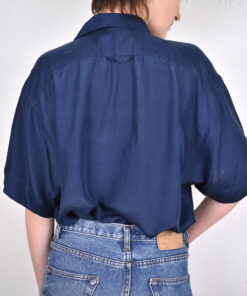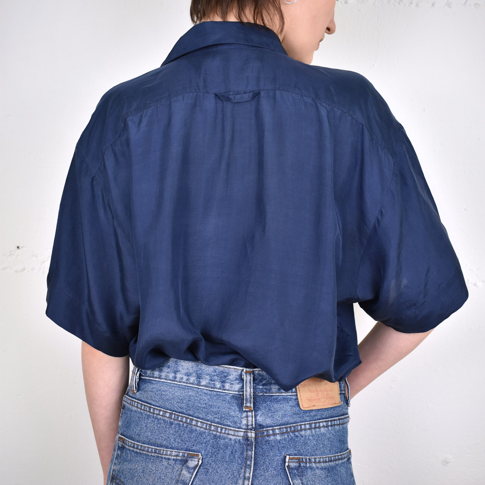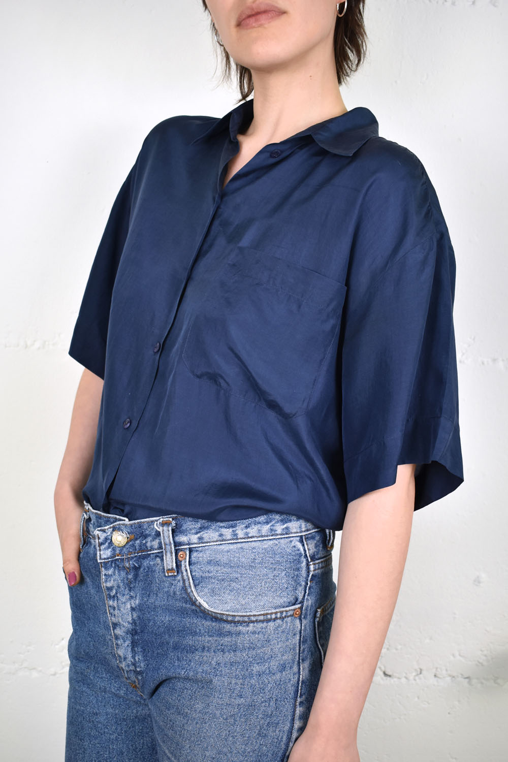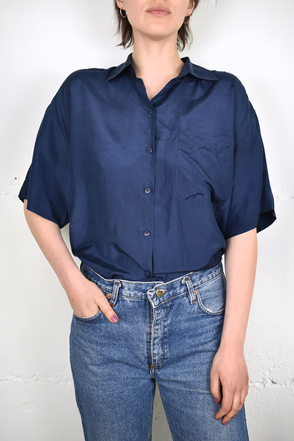 Dunkelblaue Kurzarm-Bluse von Malina Wong aus 100% Seide. Größe 42.