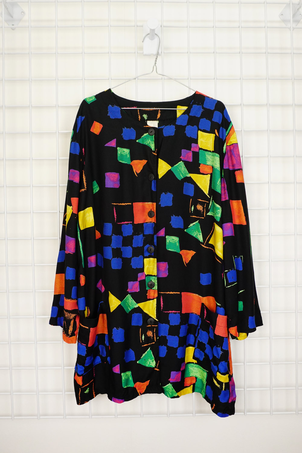 Langärmelige Sommerjacke aus den 80/90er Jahren aus 100% Viskose. Schwarz mit frischem, buntem Muster – perfekt als luftige Oversized-Sommerjacke. Entspricht der Größe 42-44.