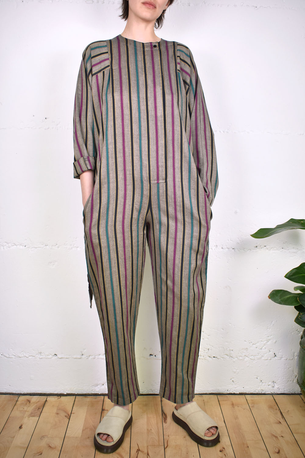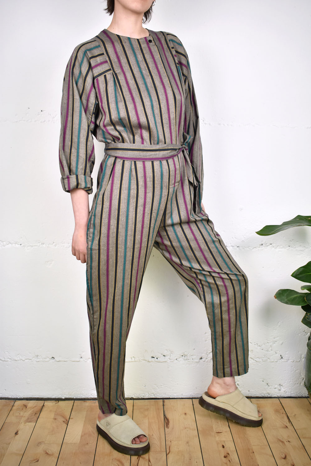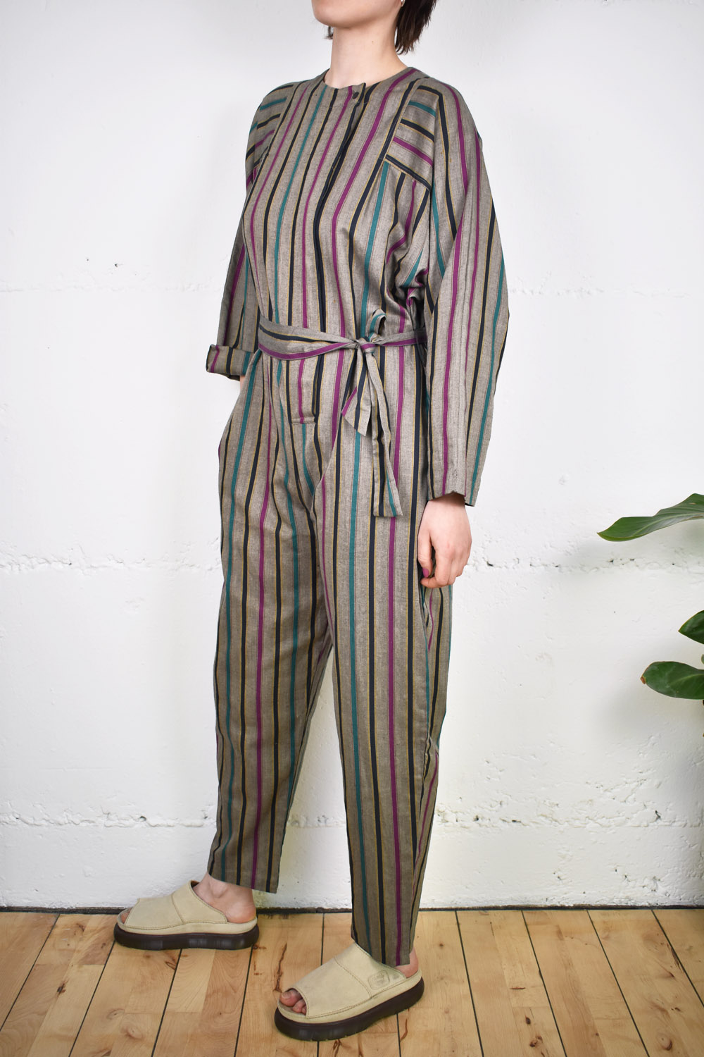 Ausgefallener Einteiler aus dickem Stoff von Diane von Fürstenberg. Der Einteiler ist weit geschnitten, wird vorne geknöpft und kann sowohl mit als auch ohne passendem Stoffgürtel getragen werden. Größe M.