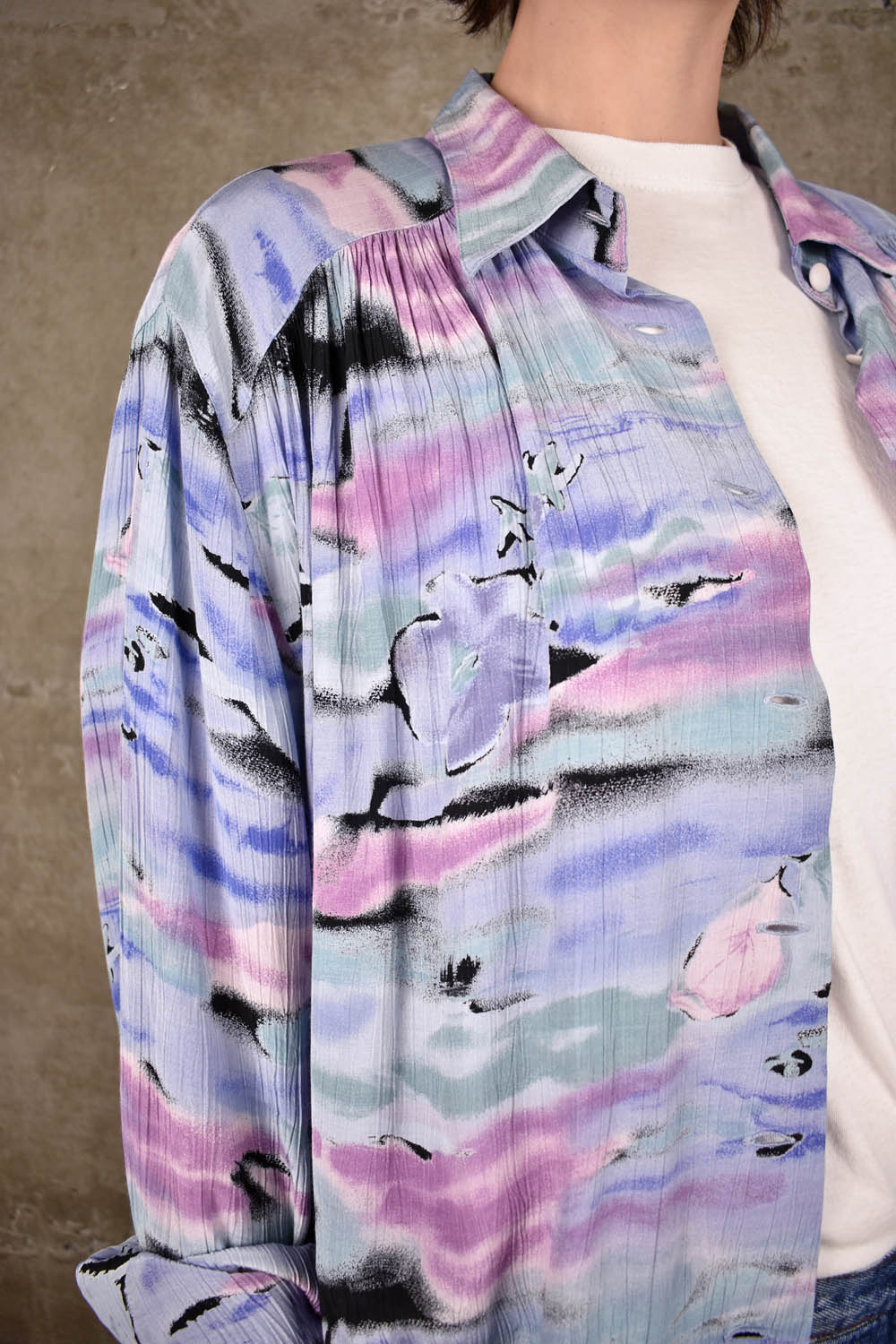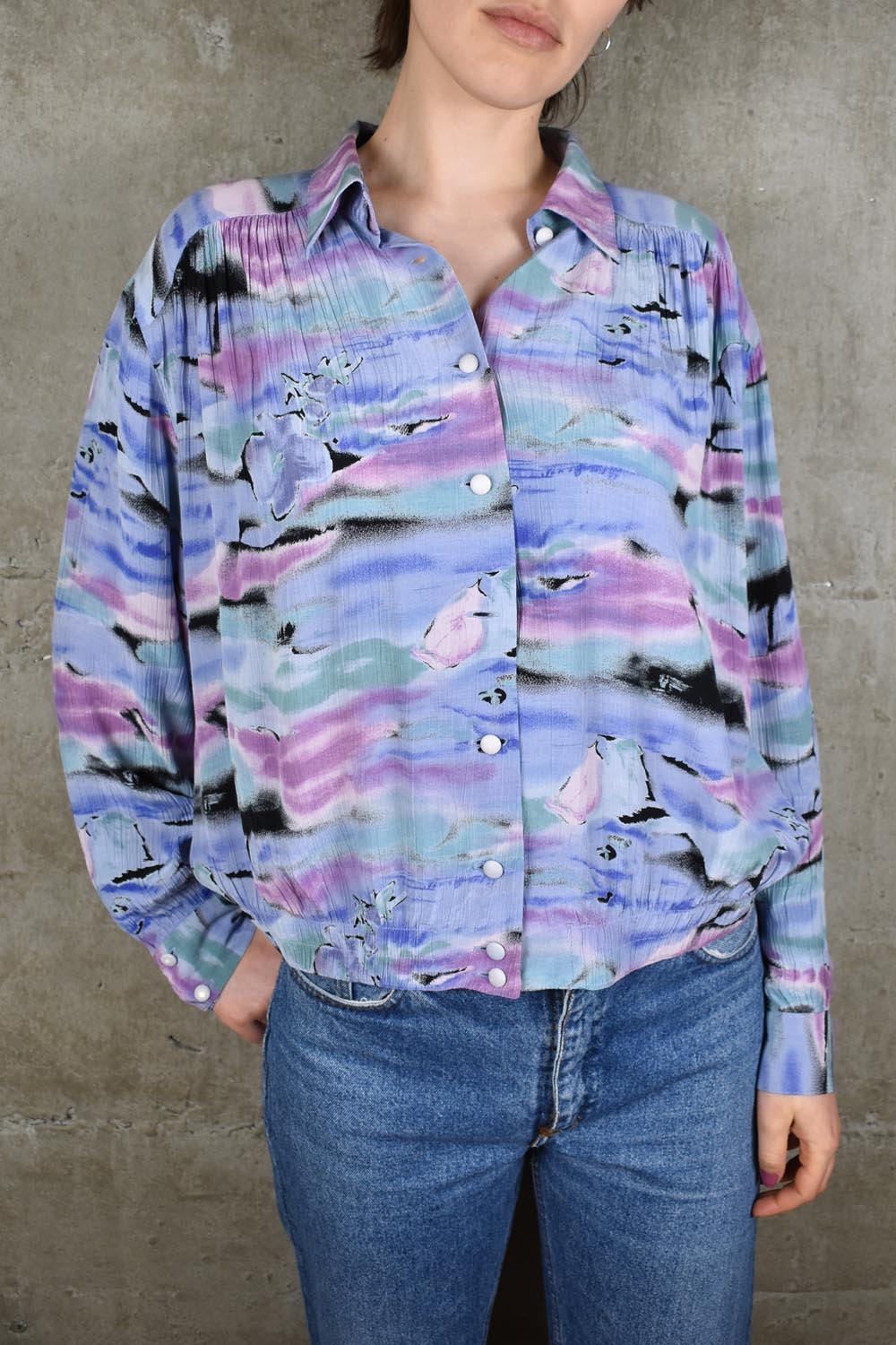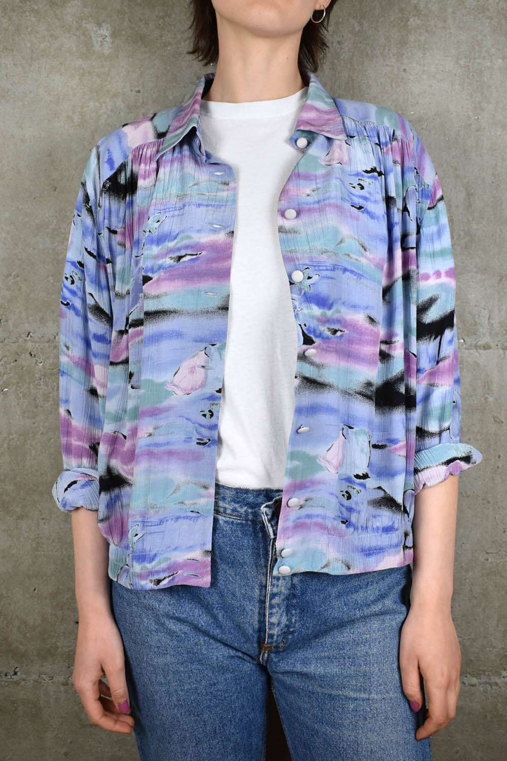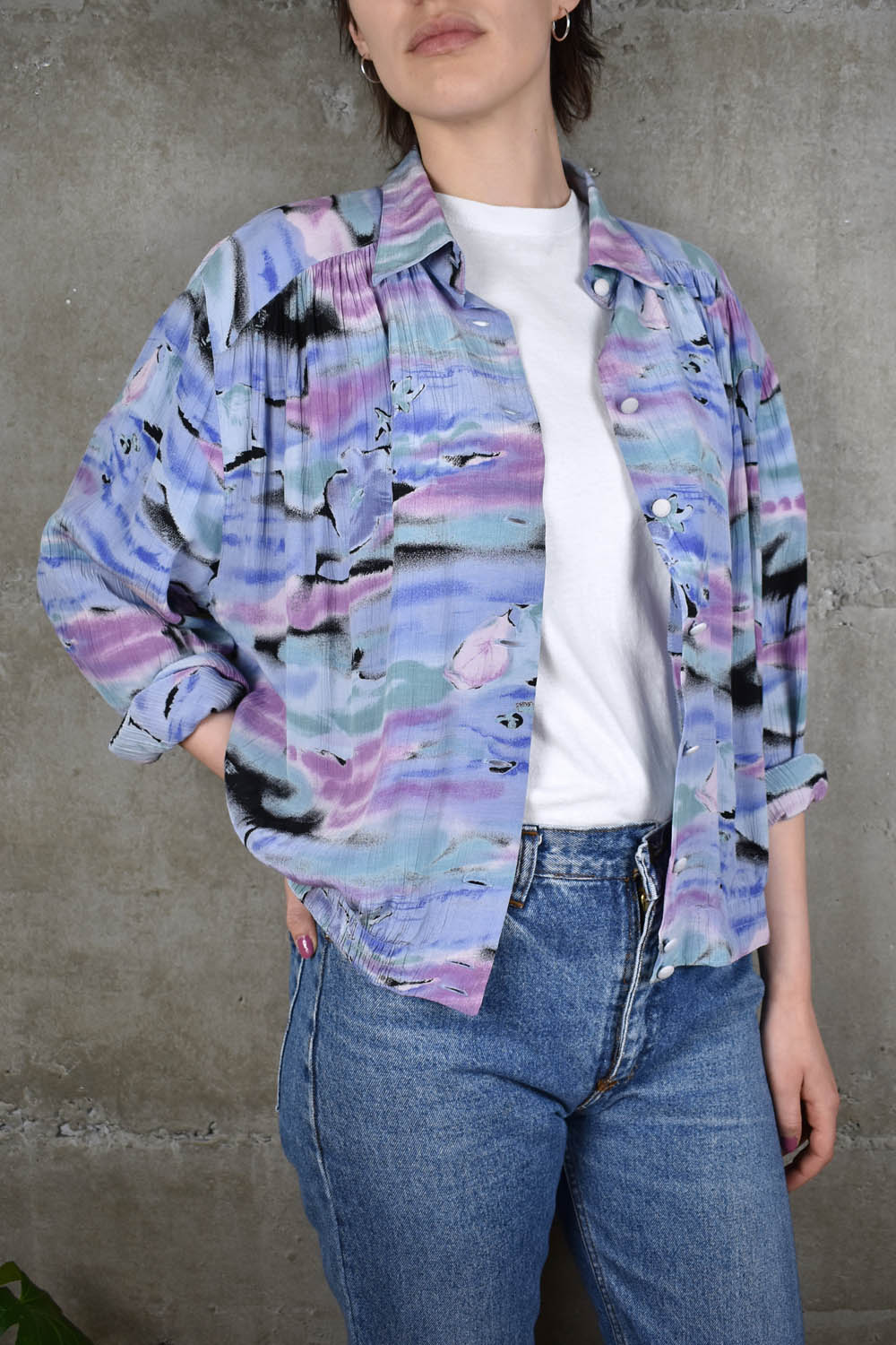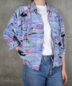 Kurze Sommerjacke / Bluse aus Viskose und Baumwolle in Lilatönen. Entspricht der Größe L-XL.