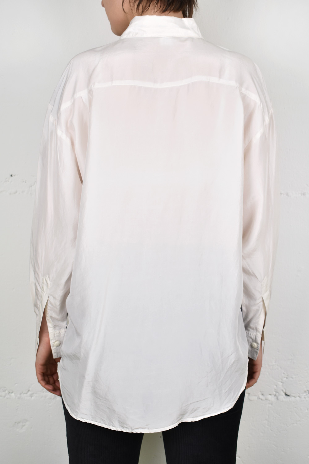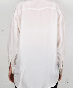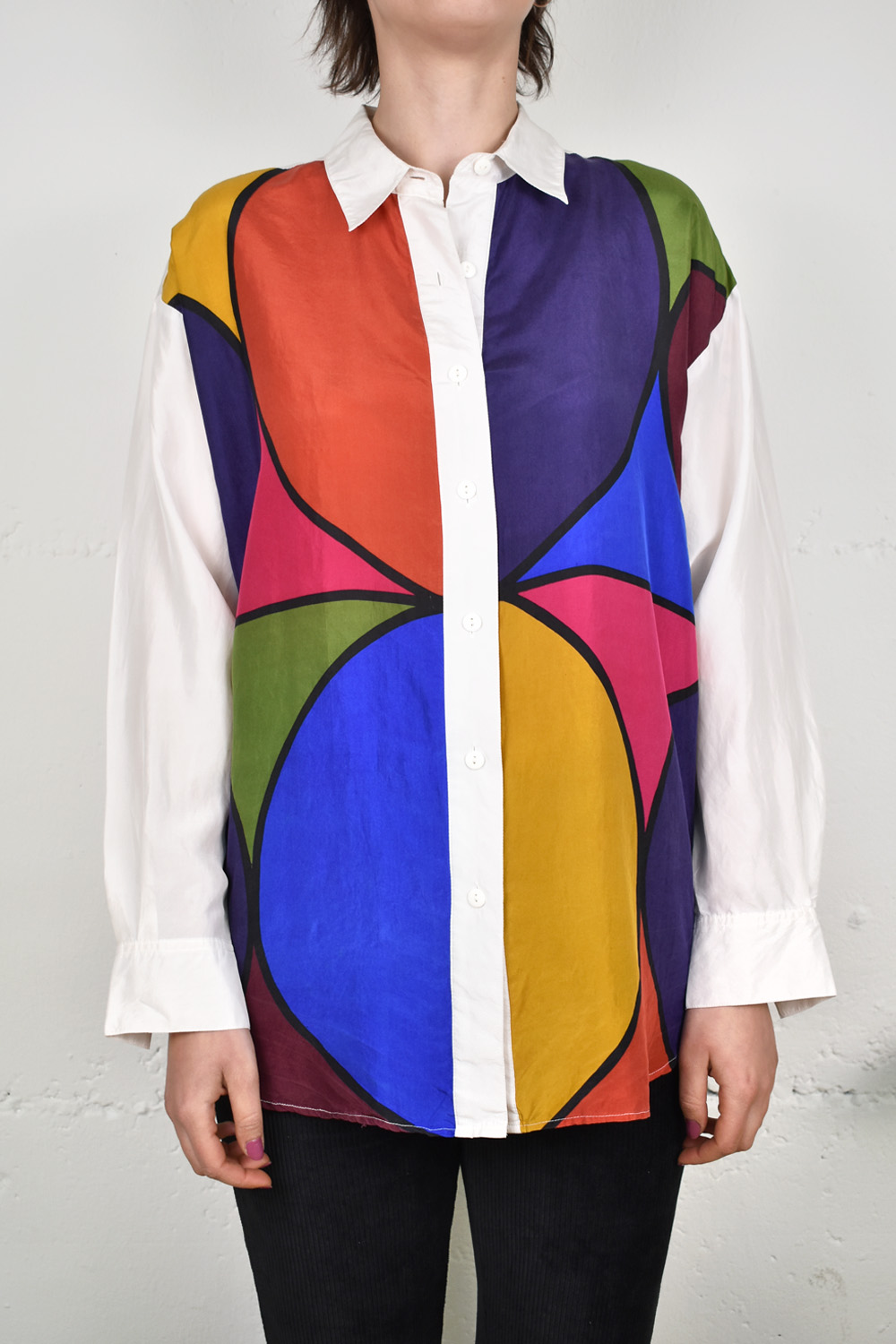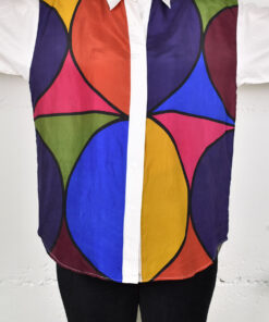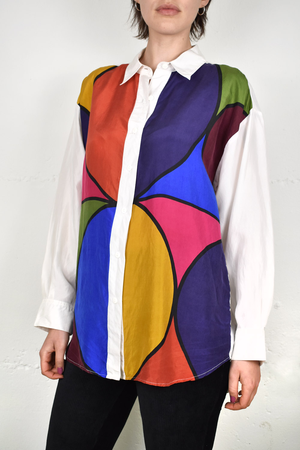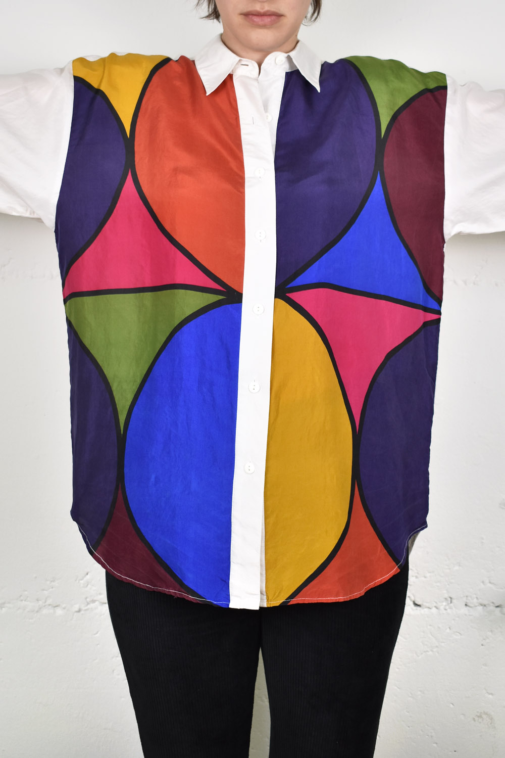 Farbenfrohe Seidenbluse in Größe M-L, großzügig geschnitten. Die Bluse ist auf der Rückseite weiß.