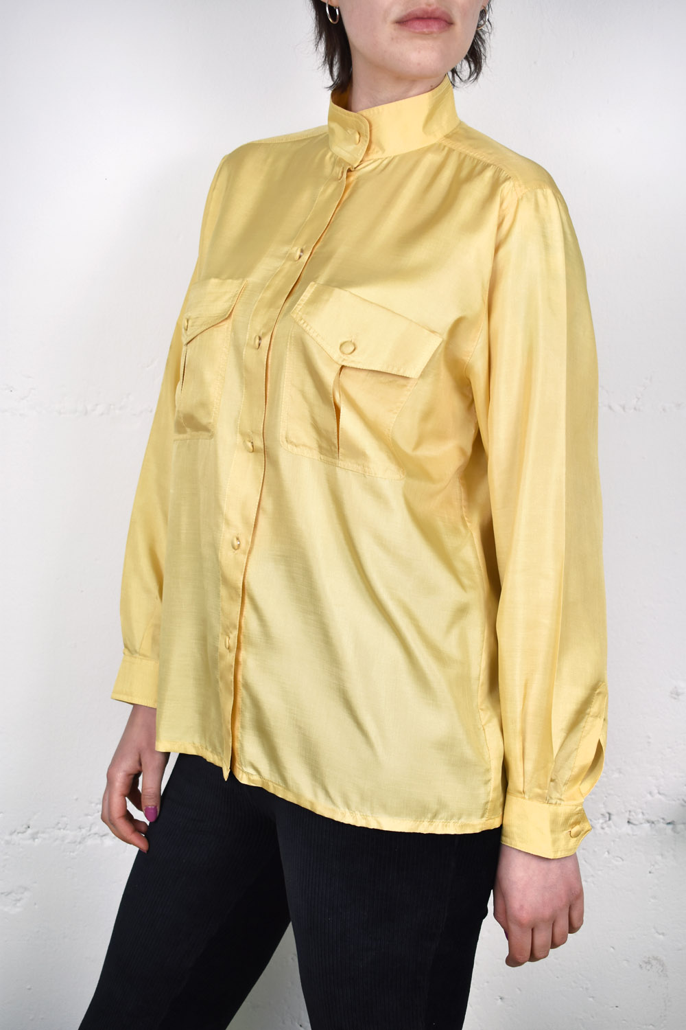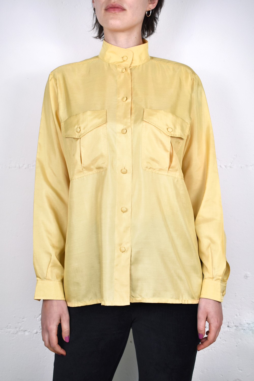Bluse von Mario Rosella aus 100% Seide in der Größe 40. Die Bluse verfügt über einen schönen Stehkragen, seidene Knöpfe und zwei aufgenähte Brusttaschen.