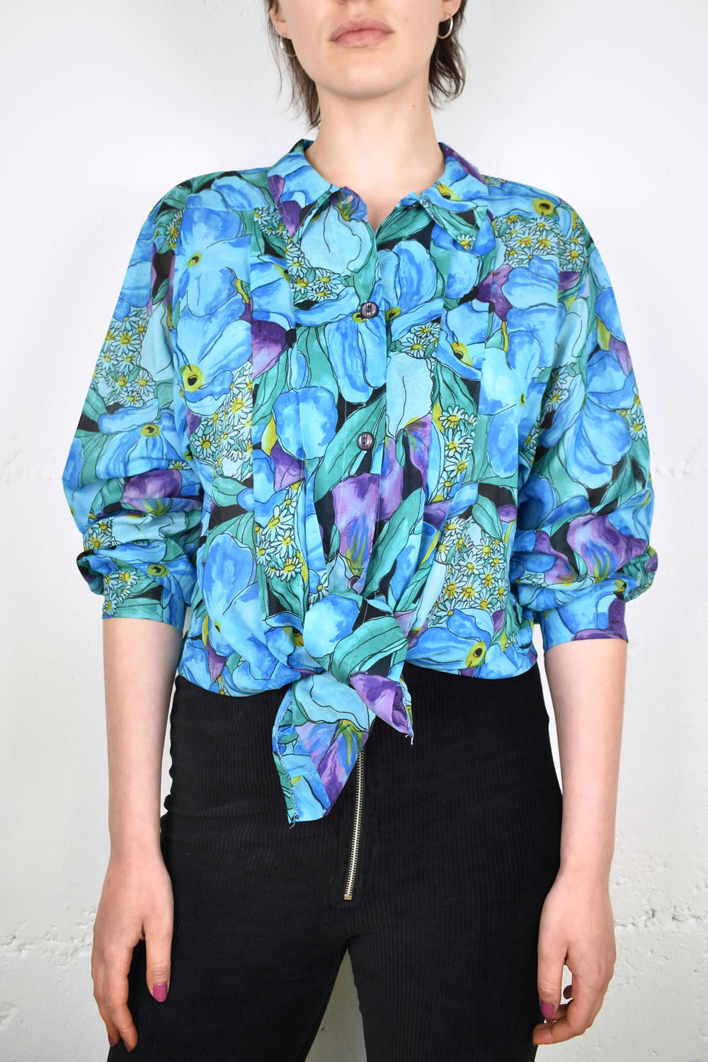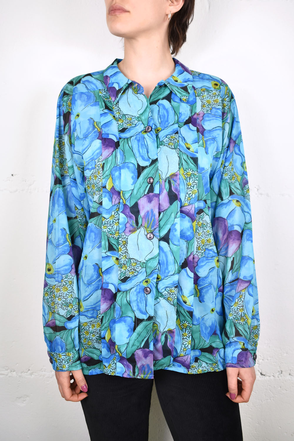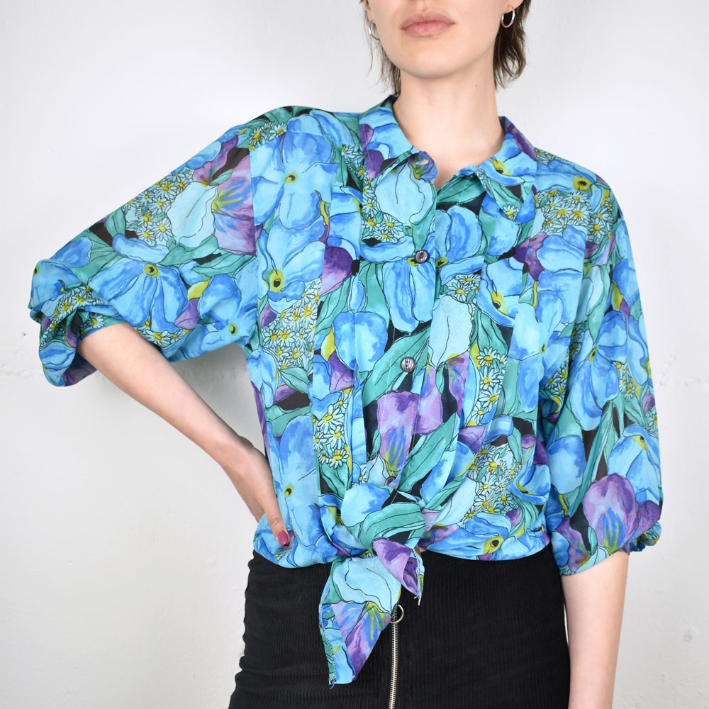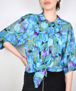 Leichte 80er Jahre Sommerbluse von Giusy Mode Milano aus 100% Polyester in frischen Türkis- und Lilatönen.